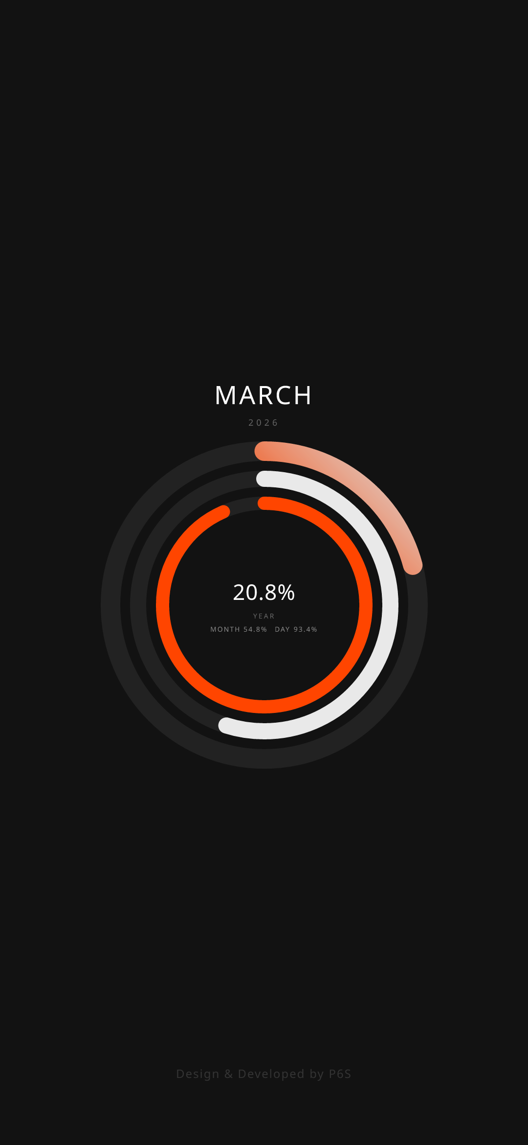 Concentric rings: outer year, middle month, inner day—instant progress at a glance.